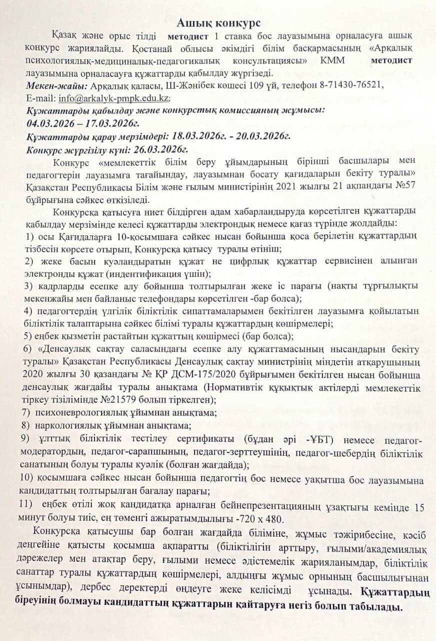 📢 Әдіскер бос лауазымына (1 жүктеме) ашық конкурс жарияланады!